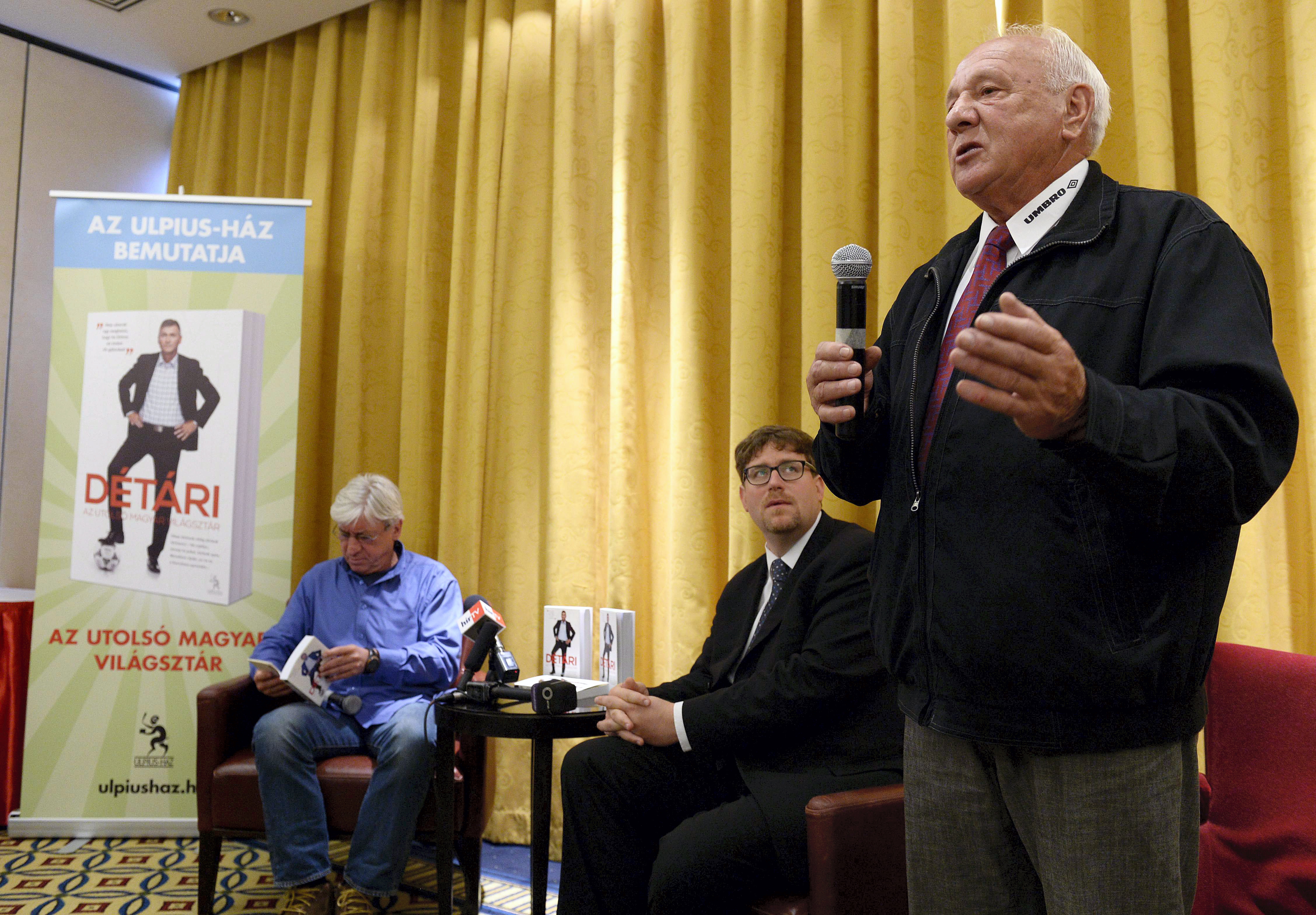 Budapest, 2013. szeptember 24. Komora Imre labdarúgóedző (j) a Détári Lajosról, a 61-szeres válogatott labdarúgóról készült, Az utolsó magyar világsztár című könyv bemutatóján a budapesti Marriott Hotelben 2013. szeptember 24-én. Mellette Buzgó József, a Nemzeti Sport főszerkesztője (b) és Szöllősi György, a FourFourTwo futballmagazin főszerkesztője (k). A 299 oldalas mű az eddigi utolsó magyar világbajnoki gól szerzőjének játékos és edzői pályafutását mutatja be, valamint rövid betekintést enged az ötvenéves Détári ( Döme) családi életébe is. MTI Fotó: Bruzák Noémi